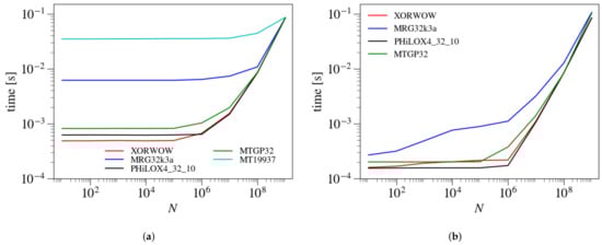In both implementations, the XORWOW and PHILOX4_32_10 are the fastest generators followed by MTGP32. The XORWOW generator uses the XOR and shift bitwise operations which require one clock cycle for execution [], while PHILOX4_32_10 is a non-state PRNG (i.e., it uses thread ID as its state) based on counter to generate PRNs, which enables faster speeds []. The slowest generators are MT19937 for the host API implementation (as mentioned earlier, this PRNG is not supported in the device API implementation), while the MRG32k3a generator is the slowest in the device API implementation. The big state size of MT19937 of 2.5 kB leads to low occupancy of SM cores because of the limited size of local memory per SM. The modulus operator of MRG32k3a generator has a latency of 22–29 clock cycles [,], which leads to longer execution times.