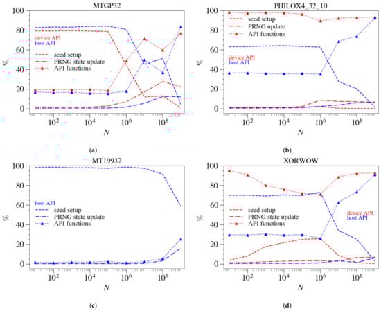 Percentage ratio of different computational parts as a function of N for various PRNGs. (a) MTGP32 (b) PHILOX4_32_10 (c) MT19937 (only supported by host API) (d) XORWOW. The dashed lines represent the PRNG seed setup time; the dashed-dot lines are PRNG state update time, and the dotted lines with triangle markers are for API functions.