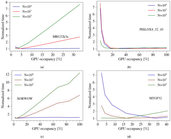 Figure 7 shows the normalized time as a function of GPU occupancy for the four PRNGs (note that since the MT19937 implementation does not support device API [], it is omitted from this analysis). The time is normalized to its lowest value that can be reached for this PRNG and GPU for a given N. The PHiLOX4_32_10 generator reaches the fastest performance when the GPU occupancy is . This is due to a combination of two reasons. First, this PRNG has a small state (cf. Table 1), so we can fit more threads into the GPU memory. Second, this PRNG has a small seed setup time (cf. Figure 6), so increasing thread number, which leads to a longer seed setup, will not negatively affect the overall performance. Instead, more threads lead to faster PRNG state update and AR calculations due to enhanced parallelism. For XORWOW PRNG, the fastest performance is reached at occupancy of for and , while for , the execution is not sensitive to occupancy.