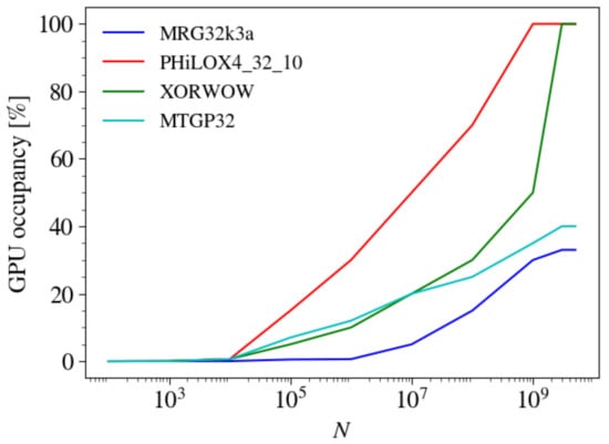 The situation is dramatically different for the other two PRNGs. For example, the MTGP32 generator never reaches occupancy above because of the limited number of blocks and threads that can be used to generate PRNs according to the implementation of this PRNG on GPU []. The MRG32k3a stays below occupancy. This is caused by memory intensive modulus operator that is used for seed setup and state update for this generator [,]. The occupancy does not increase with increasing N beyond , as demonstrated in Figure 8.
