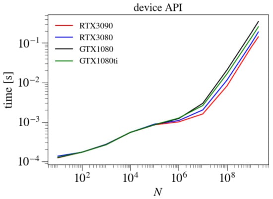 Figure 9 shows the execution time as a function of N for the default fiducial parameters for different GPU cards. Since GPU cards are under-utilized for small , different cards yield similar results. As the occupancy of the card grows with increasing N, different cards yield varying execution times. The fastest card is RTX3090, followed by RXT3080, GTX1080Ti, and GTX1080. This correlates with the number of cores available in these cards. Moreover, the RTX cards support the newer Ampere architecture compared to the Pascal architecture of the latter two.