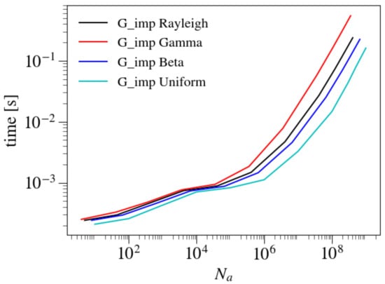 Figure 10 shows the execution time for uniform and non-uniform distributions for the G_imp implementation as a function of the number of “accepted” PRNs (). Since the uniform distribution does not require the application of the AR algorithm, it is the fastest to compute. For example, for , it is faster than the Gamma, Rayleigh, and Beta distributions by a factor of 2.78, 1.90, and 1.60, respectively. The different execution times of the non-uniform distributions are the direct result of the different acceptance rates of each distribution to construct non-uniform distributions (cf. Section 2.3). The execution times of different distributions diverge further with growing N. The reason for this behavior is that at smaller , the contribution of state setup and API function calls to the overall execution time dominates over the contributions of the AR algorithm and the PRN state update algorithm. At large , the contributions of the latter two become more pronounced, leading to stronger differences. For example, at , the uniform distribution is faster than the Gamma, Rayleigh, and Beta distributions by factors of , , and , respectively.