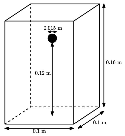 The settling of a single sphere has been investigated by ten Cate et al. [45] both, experimentally and numerically. Therefore a sphere of diameter with density was placed from the bottom in a container of height and a width and depth of , as shown in Figure 1. This setup was used to examine the settling for different Reynolds numbers by varying the fluid density and dynamic viscosity . The same setup was chosen for the simulations with different discretization parameters for each case. The values were given along with the simulation results of ten Cate et al. [45] for a resolution of four cells per particle radius in Table 1. The Reynolds number was given in this case according to the values in the table by . For the boundaries, a no-slip halfway bounce-back condition [79] was chosen.