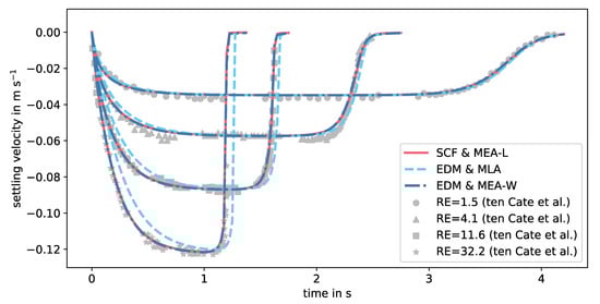 From the simulations, the root mean squared error (RMSE) relative to the maximum absolute velocity of the respective case and the deviation of the maximum settling velocity compared to the one calculated according to the drag correlation by Abraham [60] are given in Table 2 for and in Table 3 for . To further compare the whole curves, similarity measures were calculated [80], i.e., a partial curve mapping (PCM) [81] and the area between curves according to Jekel et al. [80]. The latter was less influenced by noisy data or outliers. As reference solution in this calculation, the experimental data of ten Cate et al. [45] were used and approximated by a polynomial fit of 18-th order. The RMSE of the fit for case 1 to 4 was given by , , , and . The values were rounded to six decimal places to demonstrate that some differences (e.g., between MEA-L and MEA-W) were on a negligible level for this case.