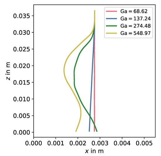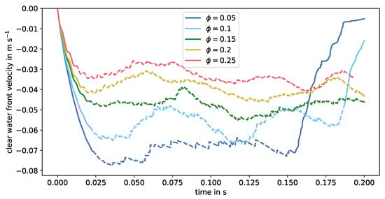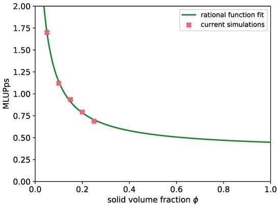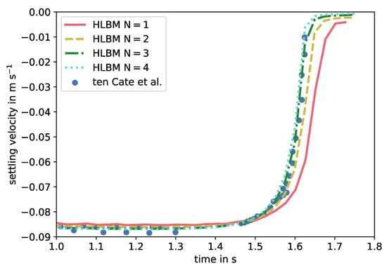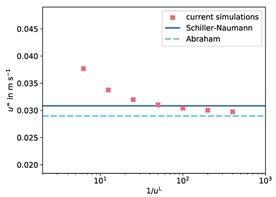 The grid spacing was given by , this means the particle diameter was equivalent to 8 grid cells. As stated by ten Cate et al. [45], DNS methods experience a non-physical dependency of the drag force on the kinematic viscosity. This has also been investigated by Rohde et al. [82] for a boundary taking the actual, non-voxelized, surface. This effect is described to be less significant for and a scaling procedure is proposed to estimate the hydrodynamic radius for the simulation. In this study, the radius and grid spacing were kept fixed, only the temporal discretization was adapted. LBM simulations required the maximum occurring velocity in lattice units to be much smaller than to ensure incompressible flow conditions and stability. Estimating the maximum velocity by the drag correlation in Equation (8) and choosing the discretization such that this velocity was equivalent to in lattice units finally led to