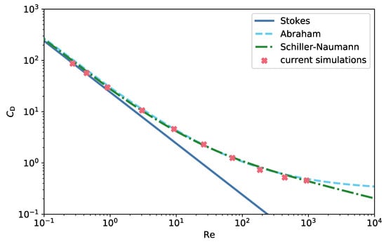 for the cases considered in this work, with a particle’s diameter . For small Reynolds numbers the drag coefficient is described by Stokes’ law [59]