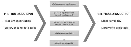 When dealing with optimization problems, challenges emerge from the computational complexity, such as the excessive execution time and the high memory usage [36]. A common practice in those situations is the development of a preprocessing stage for the reduction of the amount of data to be processed in the solution through (a) the elimination of unnecessary information that comes from the problem itself or by (b) removing the faulty values of the dataset according to the problem. This section extends and solidifies the preprocessing algorithms for business process design composition and optimization initially presented in [6]. The inputs, outputs, and steps of the p3 preprocessing are shown in Figure 2. The aim of the p3 stage is to increase the efficiency of the composition and optimization algorithms using a two-fold strategy: (i) examination of the scenario validity of a given problem, and, (ii) investigation of the task eligibility for each of the candidate tasks.