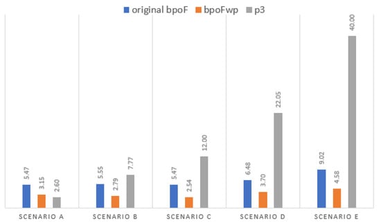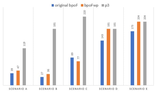 After preprocessing the library of tasks, the optimization framework is expected to increase its performance in terms of quality of solutions. In this work, the framework was operated only with NSGA-II since it appears to provide similar results with the other EMOAs (SPEA2, PESA2, and PAES) [6,35]. To achieve task composition and design optimization, NSGA-II needs to achieve two goals: (i) converge to the Pareto-optimal front (for obtaining optimal business process designs) and (ii) maintain the population diversity across the front (for obtaining a variety of different sizes of business process designs). With the inclusion of the p3 algorithms, the framework is expected to increase the number of nondominated solutions compared to the original bpoF [35] and the bpoFwp [6]. Figure 3 shows the number of nondominated solutions produced by NSGA-II for the different variations of bpoF. There was a significant increase in the framework performance for the scenarios A, B, and C, while for scenarios D and E, both versions of preprocessing located the exact number of nondominated solutions. Given that most real-life scenarios tend to be closer to scenarios A–C, the results show a respectable shift in the quality and variation of the produced solutions. Regarding the larger library sizes, the framework operated as expected in terms of composition and optimization as previously discussed. It is speculated that for the newly introduced scenarios D and E, despite the 20% reduction in library tasks with the p3, their post-processing size is still computationally expensive for NSGA-II; thus, it cannot operate more efficiently than before.