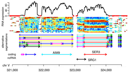 The boundaries between segments typically are not clearly visible in individual data tracks. Such limitations can often be alleviated by aggregating multiple experiments or measurements. In the yeast RNA-seq data shown in