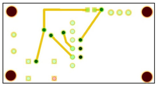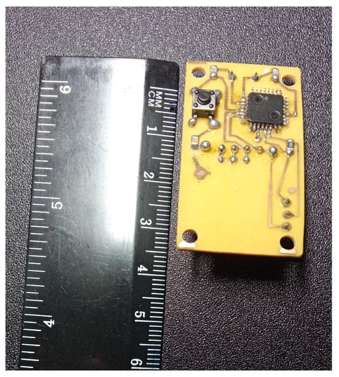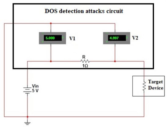 The DoS attack detection circuit is a standalone circuit, specifically a custom-made board embedding a microcontroller, input/output ports and ground, being that it is properly programmed and placed between the target device and the power supply. The proposed circuit is a prototype of a product and differentiates from other proposed in similar works [,,], in which commercial development boards were used for proof of concept. Its logic is based on the current deviations of the target device in relation to its normal operation. A 1 Ohm resistor was inserted between the first and second measurements, allowing us to calculate the current: