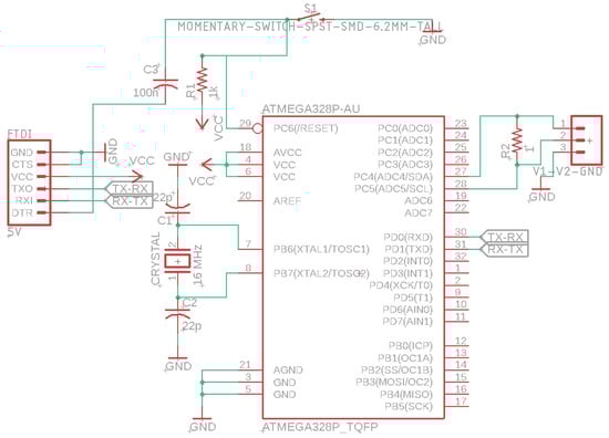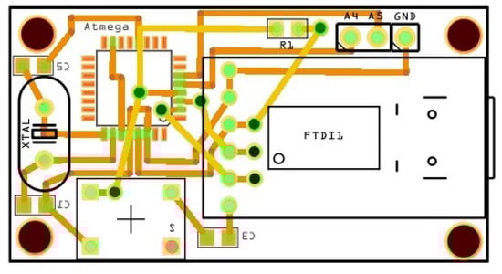 Initially, the design was developed on a platform, for the creation of the initial programming through ISP and specifically for the ATmega328P-AU microcontroller. Then the design with the following materials was implemented on a printed circuit board (PCB). The aforementioned ATmega328P-AU microcontroller is a low-power 8-bit CMOS MCU based on AVR-enhanced RISC architecture, allowing the system designer to optimize power consumption versus processing speed. We also used a two-level copper board and a 16-MHz crystal oscillator; one resistor, 0805 SMD 1 kOhm; one resistor, 0805 SMD 1 Ohm; two ceramic capacitors, 0805 SMD, 22 pF and 100 nF; for the restart of the circuit we used a Tact Switch SMD 4.5 × 4.5 mm 3.8 mm 4 pin. Finally, two pin headers, 1 × 3 female and 1 × 6 female right angle were used for the reception of the terminals. In addition, an FTDI module was added for better functionality, which was set to 5 Volts.