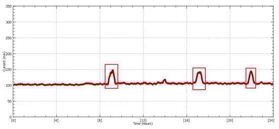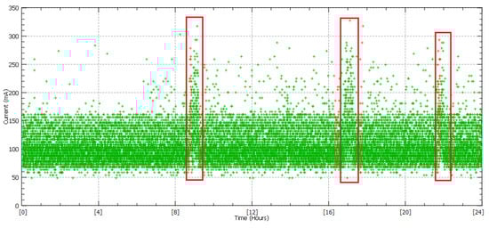Concluding the Results section, we can now observe the processed values of the current in Figure 9, in which the irrelevant spikes have been filtered out from the current signal and the detection of the DoS attack in all three phases of the day is clearly possible. A threshold comparison to the mean value is sufficient to detect the suspicious behavior. Furthermore, extension of the detected region and the consecutive frequency is also another factor for detecting the intrusion, since no intrusion via the network is conducted with a single network packet but rather with a vast number of them, extending the time the attack is performed.