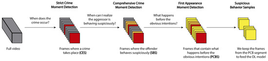 To extract the samples from the videos, we follow the process depicted in Figure 3. Given a video that contains one or more shoplifting crimes, we identify the precise moment when the offense is committed. After that, we label the different suspicious moments—moments where a human observer doubts what a person in the video is doing. Finally, we select the segment before the suspect is preparing to commit the crime. These segments become the training samples for the Deep Learning (DL) model.