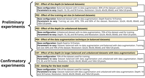 We conducted a total of six experiments in this work. These experiments are divided into two categories: preliminary and confirmatory. The first four experiments are preliminary as they focus on exploring the effect of different configurations under different scenarios, aiming to find some suitable configurations that may lead to better model performance. We refer to the last two experiments as confirmatory as we tested the system on more challenging configurations derived from the preliminary experiments, to validate the approach. Among all these experiments, a total of 708 models were generated and tested. Although the specific details of each experiment are detailed in its corresponding description, for the ease of the reader, we have provided an overview of our experimental setup in Figure 5.