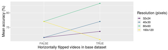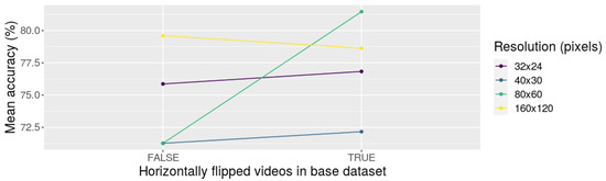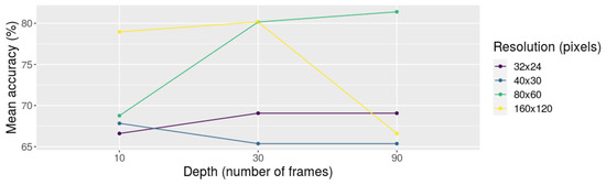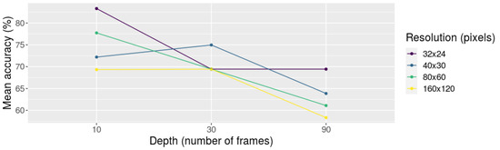 By analyzing the statistical results, we found that neither the main effects are significant, nor their interaction (with a significance level of 5%). The p-values obtained from the two-way ANOVA for the main effects of depth and resolution in this experiment were 0.1044 and 0.6488, respectively. The p-value for their interaction was 0.9502. As there is no statistical evidence that suggests that changes in the depth or the resolution affect the accuracy of the model, we extended the analysis and considered inspecting the interaction plot, which is depicted in Figure 6. This interaction plot suggests that independently of the depth considered, using 160 × 120 pixels as resolution obtains the worst results. Furthermore, based only on the 36 observations analyzed, using ten frames and 32 × 24 pixels obtains the best average results on the fixed values used for this experiment. For this reason—and based on the fact that we could not derive any other conclusion from the statistical perspective—we considered using ten frames as the best value for depth for the next set of experiments.