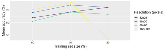 To have a better look at the behavior of these configurations, we also analyzed the interaction plot of the proportion of samples from the base dataset used for training and the resolution (Figure 7). The interaction plot confirmed the idea that using 80% and 160 × 120 pixels harms the process. So far, we do not have an explanation for such behavior yet. However, we can also observe how similar the remaining configurations are, in terms of accuracy. As the best results in this experiment were obtained by using 70% of the base dataset for training purposes, we kept this value as a recommended one for the following experiments.