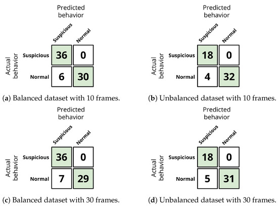 As accuracy shows the general performance of the model, we complement its information by presenting the confusion matrices of the best runs. These matrices allow checking, in detail, the model capability to classify suspicious and normal behavior. We used two additional metrics for adequately analyzing the results from the confusion matrices: precision (Equation (2)) and recall (Equation (3)). Precision indicates the proportion of samples classified as suspicious that are, in fact, suspicious—a model with a precision of 1.0 produces no . Recall indicates the proportion of actual suspicious samples that were correctly classified by the system—a model with a recall of 1.0 produces no .