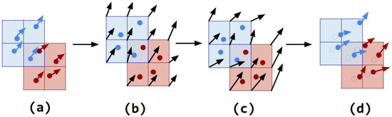 Then, the grid nodes’ velocity is calculated for both soil and water materials using drag coefficient and the updated grid nodes’ explicit forces, as shown in Figure 3b,c.