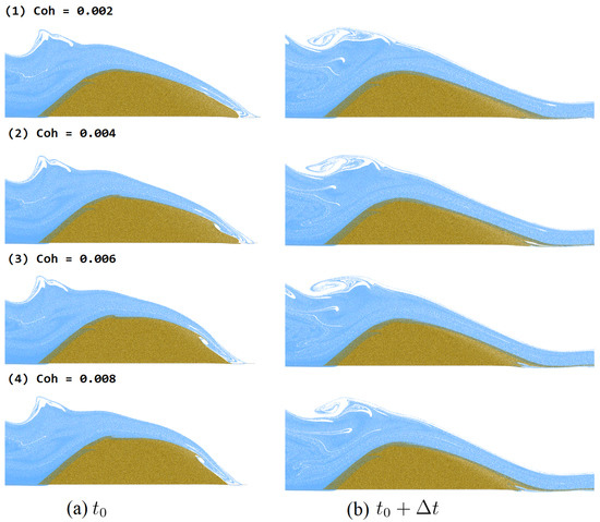 Parametric studies were conducted and are shown in Figure 4, Figure 5 and Figure 6 and Table 2. Figure 4 shows the different selection of the cohesion parameter from the range 0.002 to 0.008, which will have an influence on the overtopping dam breach erosion simulation. The result shows that with the higher cohesion demonstrated in Figure 4(4), the dam structure is more stable during the overtopping breach for the same timestamp. Especially on the right edge of the dam in Figure 4(4), the dam structure contains less shape deformation than the low cohesive dam structure at the same timestamp compared with Figure 4(3). The soil with a higher cohesion parameter for the earthen embankment homogeneous cohesive dam will maintain the dam structure from the overtopping dam breach.