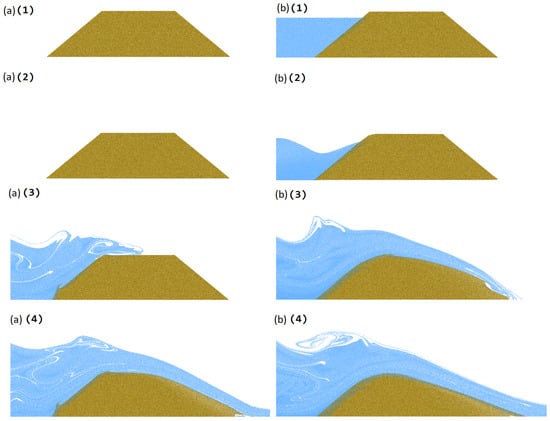 The overtopping dam breach simulation with an empty (a) and full (b) reservoir at different timestamps ((1)–(4)).