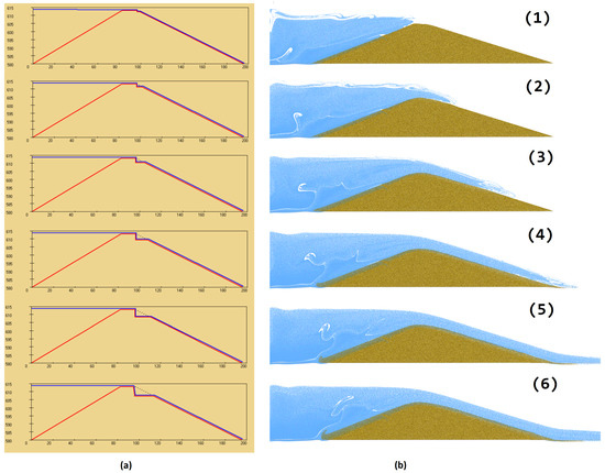 Furthermore, the WinDAM C [40] 05-HR-OBA example was applied to the proposed MPM simulation, and the comparison result is shown in Figure 6. WinDAM C [40] is a module used to analyze overtopping earth embankments. Figure 6a is the output from WinDAM C. Figure 6b is the simulation results using the proposed MPM simulation model. The parameter setting and condition for the cohesive dam overtopping failure cases are shown in Table 2. The dimension and dam structure specs are set up in the column 05-HR-OBA in Table 2. WinDAM C simulates the result using the same 05-HR-OBA example. As shown in Figure 6, from Figure 6a’s WinDAM output, the dam breach erosion process gradually deforms the right top edge of the dam crust. The physical-based erosion model used by WinDAM is the Hanson/Robinson stress-driven model [50]. Hanson/Robinson’s model assumes a vertical cut in a cohesive soil is located at a distance of half the bank height back from the edge. Furthermore, the head cut is made to advance through a series of mass failures driven by erosion at the base. Therefore, the model will erode the cohesive soil on the base surface and form a wedge-shaped notch.