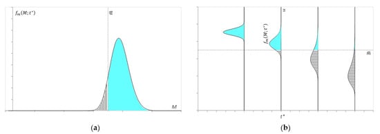 As already mentioned, the fragility curve defines the probability of a system to overcome a certain damage threshold, , at a certain time . Therefore, once the damage threshold has been defined, the probability that it is reached in the instant t*, is described by the area underlying the p.d.f. at the left of the threshold. On the other hand, the probability of exceeding this threshold is described by the area underlying the p.d.f. at the right of the threshold itself (Figure 1a).