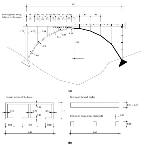 Bridge over the Corace River: (a) Dimensions of the arch bridge and (b) details of the current section of the beam, of the arch bridge and of the columns (measures expressed in meters).