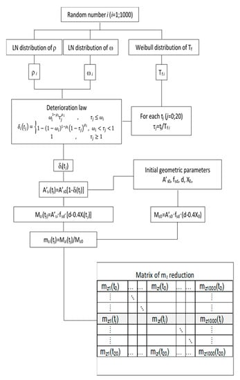 If an investigation of 100 years of life in 5-year steps were to be carried out, it would create a matrix of 21,000 samples of mz (Figure 3). In the flow chart of Figure 3, t0 corresponds to the initial state of the bridge; therefore, t0 = 0 years, while t20 corresponds to the state of the bridge after 100 years of service life—therefore, t20 = 100 years.