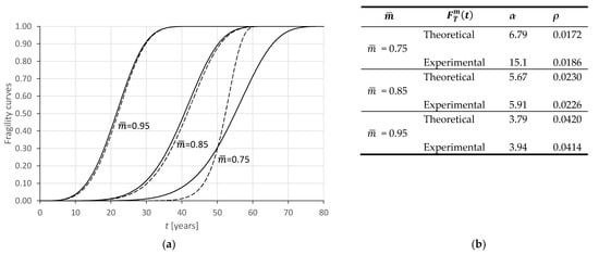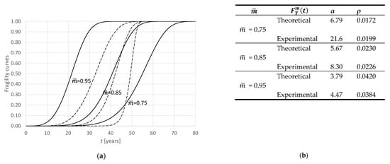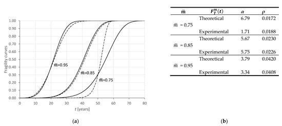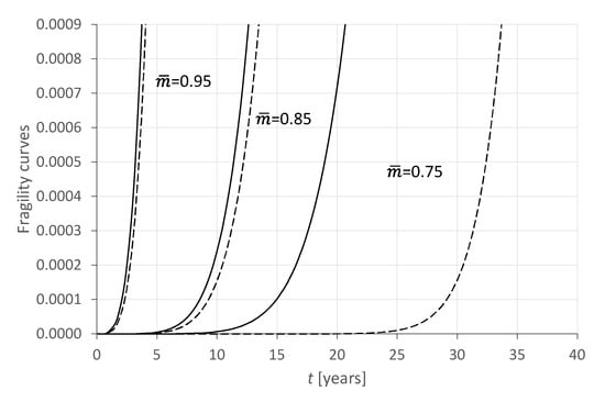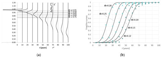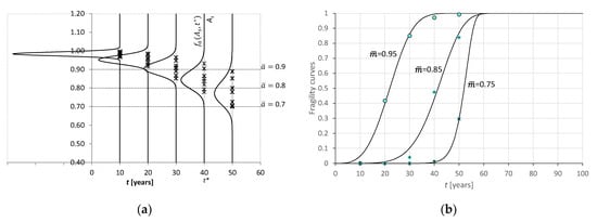 where is the cumulative distribution function of the r.v. . The probability distribution is able to associate the probable time of occurrence with each level of damage. Therefore, it has the value of a fragility curve in predicting the evolution over time of a certain parameter of structural deterioration [32,33].