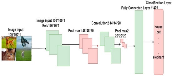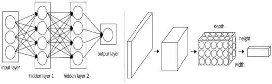 After edge detection and feature extraction by applying the Mamdani fuzzy rules, CNN is used to train and build a model capable of predicting the new object. CNN can simulate and build a model that classifies the color images; for example, when a green color image is 100 * 100 pixels, then the CNN model’s hidden layer is designed to be 100 * 100 * 1 = 10,000 Weight. Then, the CNN input solves the scalability problem. The layers of CNN possess neurons arranged in three dimensions (height, depth, and width), as demonstrated in Figure 8.