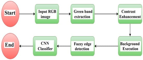 - Extracting green channel: The Red-Green-Blue images are transformed into green-channel pictures. Moreover, the green channel gives an intensity, which is higher [33] and extreme local contrast among the foreground and the background [34] compared to the other two channels.