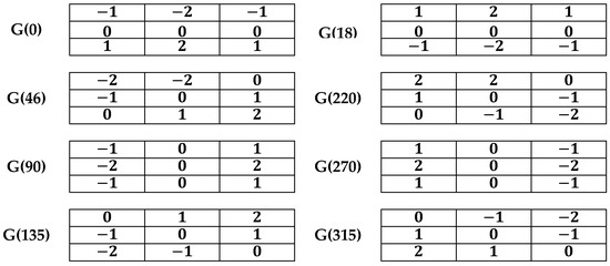 The eight directions of the convolution kernel are employed for calculating eight gradients in various directions, which decrease to four gradients. The Robinson operator possesses the eight convolution kernels to mirror the gradients, and the maximum mirror gradient is chosen as shown in Figure 7.