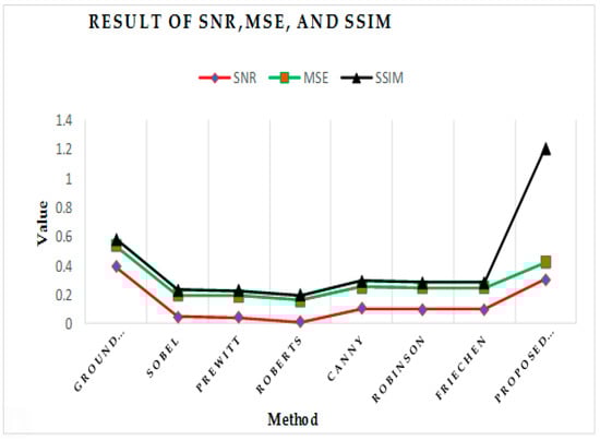 This result is related to other traditional methods to determine boundaries, but images have shown that specific animals were disconnected. The fuzzy method delivered better results than the Prewitt factor, Robert, and Laplacian operators. Canny and Robinson’s operators had a good result visually and showed fewer results than fuzzy logic. The comparison of obtained results was evaluated using the following performance measures: peak signal-to-noise ratio (PSNR), signal-to-noise ratio (SNR), mean-squared error (MSE), and structural similarity index (SSIM) [40,41,42], as illustrated in Table 3 and Figure 10.