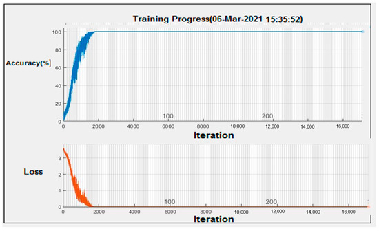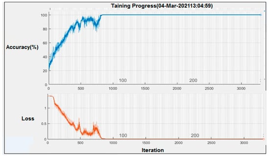 The results of training the CNN network are shown in Figure 12. In epoch 1, the Elapsed time parameter was set to 2 s, and the achieved rate of accuracy was 25.78%, and the parameter of mini-batch loss was 1.3868. Then, at epoch 73, the accuracy rate reached 100%. The parameter of mini-batch loss was 0.0172, while the elapsed time was 27.35 min.