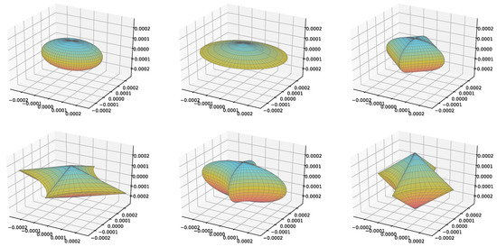 Some examples of particle shapes considered via superellipsoids. Depicted (from left to right and top to bottom) are the particles with ID 5, 17, 28, 143, 166 and 200, according to Appendix A.