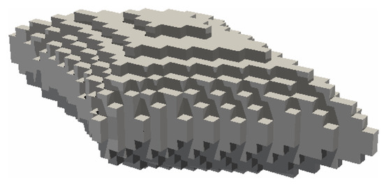 Another common parameter is the convexity , defined as the ratio of the particle’s volume to the volume of its convex hull, taking values between 0 and 1. The sphericity , as defined by Wadell [40], has already been used in many studies regarding the particle shape [19,23]. It also takes values between 0 and 1, with the latter being a perfect sphere. Defined as the ratio between the surface of a volume-equivalent sphere and the particle’s surface , it is given as