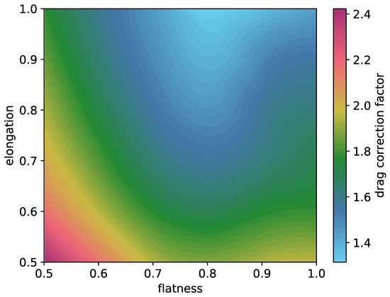 Here, denotes the drag correction factor for a particle in the Stokes regime regarding a volume-equivalent sphere. As Leith [20] found evaluating his results, these do not fully explain the experimental reference data; he proposed the application of a least-squares fit for additional terms regarding the axis lengths. Likely because these results are specific to the considered data basis, usually, only the formula depicted here is referenced.