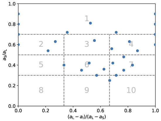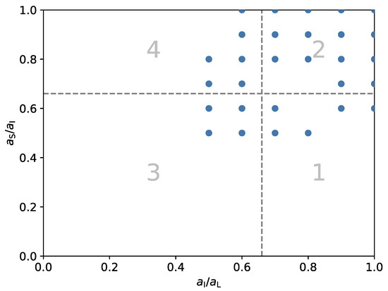 According to the approach described in Section 2.3, a particle is defined by 5 parameters. To create a collection, parameter ranges are defined, for which the half-axis lengths are defined via elongation and flatness, starting with . Varying the particle’s density, the parameters