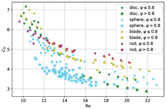 with A denoting the projected surface of the considered object in the direction of the relative flow. The drag coefficient depends on the shape of the particle [24,37], but mainly on the Reynolds number