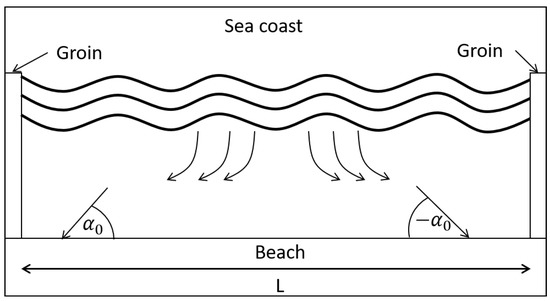 To analyze the evolution of the shoreline on a long-term scale, the numerical results of the beach scenario are considered and the solution to the idealized problem is introduced. Assuming, during the simulation, that the length of the shoreline considered is m, we set the physical parameter in Table 1, Table 2 and Table 3. The simulation setting is illustrated in Figure 3.