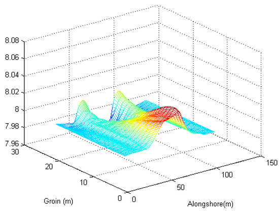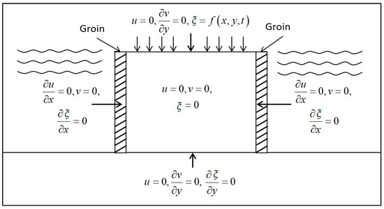 Assuming that the break-water is not a perfect barrier to water as it is made of an aggregate of rocks with large gaps, the boundary conditions were as follows: for waves coming into the beach, for left and right groin structures, and for along the beach, as shown in Figure 4.
