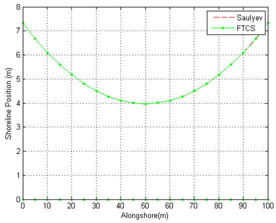 The evolution of the coastline in each year is predicted by the use of a traditional forward time-centered space technique and Saulyev finite difference techniques, as seen in Table 5 and Table 6 and Figure 3. The distance from the most distant shoreline evolution is 7.32 m. The shortest distance from the shoreline evolution is 3.96 m. The calculated shoreline evolution of the two numerical techniques is closed.