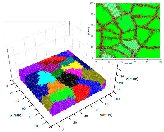 Polycrystalline sample with L = 100 muc and d = 100 muc, Ng = 16. The periodic boundary conditions along the xy plane can be identified by the colour distribution. The figure inset corresponds to the surface view, showing the grain boundaries.