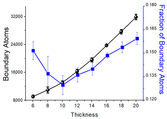 Number of boundary atoms and the fraction of them with respect to the sample for different thicknesses. The average grain volume was kept constant at atoms.