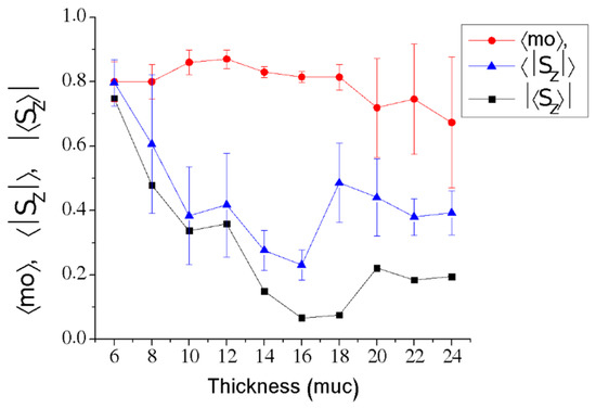 In Figure 4, between 6 and 16 muc, a decrement of can be observed as the thickness increases. This behaviour indicates a loss of perpendicular alignment. Perpendicular magnetic anisotropy (PMA) is a phenomenon produced only by surface atoms; for this reason, the increment of the thickness produces a loss of surface influence. In contrast to PMA, the dipolar interaction produces an in-plane spin configuration. This behaviour is expected, according to the experimental results presented in the literature [35]. Simulations of the competition between the PMA and the dipolar interaction for a mono-crystalline sample are presented in [4]. The results show that there is a critical thickness for changing from perpendicular to in-plane alignments. In that work, a critical thickness can be obtained when both states, in-plane and out-plane, have the same probability of occurring. In case of polycrystalline samples, the local anisotropy of each grain could be in any of the cubic axes of an MCA, which is the reason for which the transition scenarios have different spin alignments per grain (or set of grains).