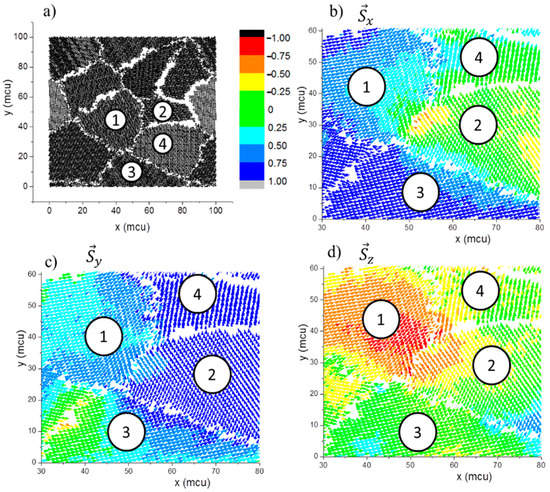 Middle plane representation at a thickness of 20 muc of (a) structural distribution, and (b–d) colour map of a final state for Sx, Sy and Sz, respectively. The grains were labelled with their number and preferential spin orientation in (a). The atoms in the grain boundaries have been suppressed for visualization purposes.