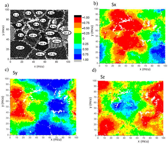 At a thickness higher than 20 muc, in Figure 4, is lower than , and is located out of the error bars. Therefore, it is considered that the grains have a high tendency to a single-domain regime per grain without correlation between them. It is also observed that presents lower values due to an average of positive and negative magnitudes. Additionally, takes values around 0.4, indicating a lower in-plane dipolar interaction effect. If the magnetic moments per grain were totally independent between them, the average value should be around 0.577, approximately. This tendency agrees with the decrease of <mo> and the increment of mo error bars presented in the same Figure 4. Figure 6 shows the middle plane of a final state of low-saturation magnetization. This figure corresponds to a thickness of 20 muc. This result is presented with the purpose to observe the three-dimensional domain distribution. Figure 6a corresponds to the structural order, in which the boundary atoms are not included for visualization purposes. Figure 6b–d are colour map distributions which identify Sx, Sy and Sz magnitudes, respectively. The numbers in Figure 6a identify the grains, while the letters indicate the preferential direction, according to Figure 6b–d. For instance, grain 13 is preferentially oriented in the −z direction, as is it possible to observe in Figure 6d. The magnetic distribution in this figure shows domains formed by more than one grain in most of the cases. Furthermore, the domain limit regions have coincidence with the grain boundaries in most of the cases.