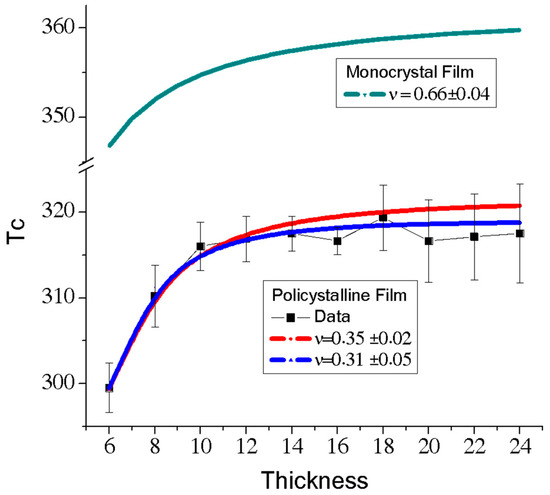 where refers to the limit of the critical temperature at high thicknesses, and is an adjusted parameter. The approximation was carried out by the Monte Carlo method under the minimum square criteria, with 10 × 106 combinations of and parameters. For a monocrystalline film, the critical exponent obtained was . This value is between 0.71 and 0.5238, as reported for thin films under a classical Heisenberg model in [38] and [39], respectively. Due to the instability observed in polycrystalline samples, fitting above 16 muc is very complicated to obtain, as it presents high deviation. For a range between 6muc and 12 muc, the exponent obtained for the fitted data was , while for a range between 6 muc and 14 muc, the exponent was. The fitted data is presented as the red and blue lines in Figure 7. This situation evidenced a diminution of the exponent in polycrystalline samples with respect to the ideal monocrystalline samples.