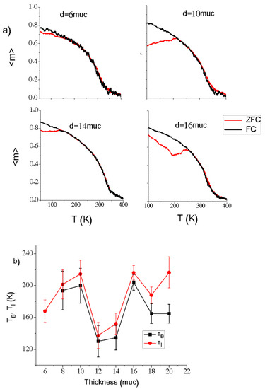 (a) Examples of FC–ZFC curves at different thicknesses, and (b) the blocking and irreversibility temperatures as a function of the thickness.