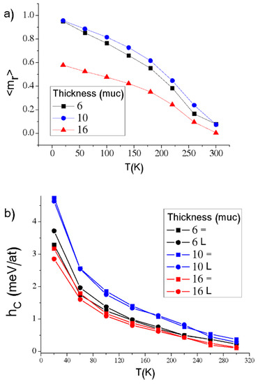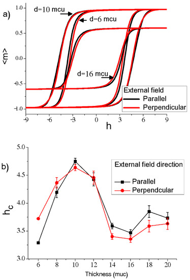 On the other hand, Figure 10a,b show the remanence magnetization and coercive field depending on the temperature, respectively. Different thicknesses were simulated; nevertheless, only 6, 10 and 16 muc are presented. The error bars are not included because this size is in the order of the mark. At a fixed temperature, makes that not present a defined tendency as a function of the thickness. However, at 16 muc is presented, because this obtained the lowest value. That lower value is due to a high effect of dipolar interaction, where magnetic moments are localized parallel to the xy plane, but in different directions, as a response to the strong single-domain tendency per grain (or small set of grains). The remanence is similar regardless of the external field’s direction, parallel or perpendicular to the film. Finally, presents a typical exponential decreasing behaviour with the temperature [43]. The slight differences between parallel and perpendicular can be observed mainly at low temperatures.